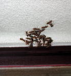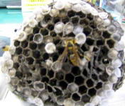 右の写真は、軒先などにアシナガバチの女王を囲みオス蜂が守っている様子です。こういう状態のときは、ハチは人間を襲撃することはありませんので怖がることはありません。しばらくしたらいなくなります。 |