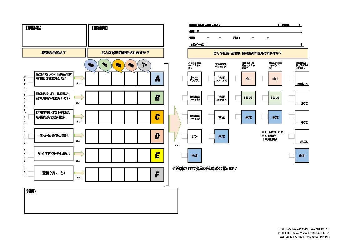 ◆検査の内容及び手数料 (問合せ先) 当センターでは次の検査を行っています ● 食品の検査 ★内容・手数料(クリック)★ ・食品細菌検査(製品)⇒ お問合せには ・期限設定保存試験 ⇒ 「問合せシート」を ・苦情品検査 ⇒ ご利用ください ・作業環境試験(拭き取り、落下細菌等) ![]() 問合せシートのダウンロードはこちら☞(PDF、EXCEL) (問合せシートで相談されると、検査項目や手数料を ご案内しやすくなりますので、ぜひ、ご利用ください。) ⇒食品検査依頼書はこちら ※お問合せ ☞ eメール(ここをクリック) ☞ TEL 082-542-8838 ☞ FAX 082-249-2466 ● 腸内細菌の検査 ★内容・手数料(クリック)★ ・食品関係施設従事者等の検便 ・腸内細菌、腸管出血性大腸菌他 ・ノロウイルス検査 ⇒腸内細菌検査依頼書はこちら ※お問合せ ☞ eメール(ここをクリック) ☞ TEL 082-542-8838 ☞ FAX 082-249-2466 ● 水質検査 ★内容・手数料(クリック)★ ・地下水や貯水槽経由水を使用している 食品営業施設の水質検査 ・ビル管理法に基づく水質検査 ・公衆浴場やプールの水質検査ほか ⇒水質検査依頼書はこちら ※お問合せ ☞ eメール(ここをクリック) ☞ TEL 082-542-8838 ☞ FAX 082-249-2466 ● 異物の検査 ★内容・手数料(クリック)★ ・異物の同定 ⇒異物検査依頼書はこちら ※お問合せ ☞ eメール(ここをクリック) ☞ TEL 082-542-8838 ☞ FAX 082-249-2466 ◆検査以外で次の業務を行っています ● 食品施設の衛生指導(HACCP他) ● 食品施設等の衛生講習会 ![]() ※食品検査センターは広島市保健所2階です |