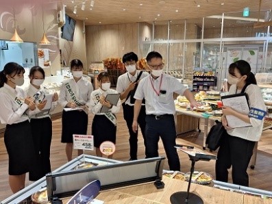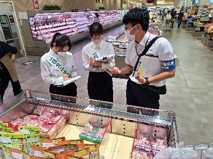 広島市安佐南食品衛生協会では、広島市保健所の協力を得て食中毒予防啓発事業の一環として、「一日食品衛生監視員」行事を令和5年8月1日(火)に行いました。 安佐南区内の2つの大学から推薦された学生8名に「一日食品衛生監視員」を委嘱し、保健所の食品衛生監視員4名の指導のもと、4名ずつ2班に分かれて管内のスーパーマーケット「ゆめテラス祇園」と「フジグラン緑井」の店内を巡視しました。 また、安佐南食品衛生協会の食品衛生指導員6名と生活衛生推進員4名は、各お店の店頭で、買物客に食中毒予防啓発物を配布し、市民に食中毒の防止を呼びかけました。 お店への巡視修了後、「一日食品衛生監視員」を経験した学生8名から、食品の表示や冷蔵庫の温度管理など、気づきや感想を発表していただくとともに、参加者全員により、学生、消費者、行政、協会の立場から「HACCPの取組み状況」についての意見交換を行いました。