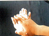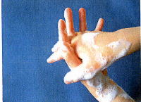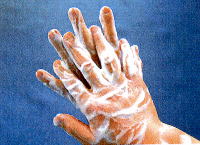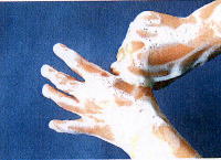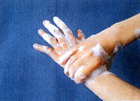 | @ 水で汚れをしっかり洗い流し、 石けんを十分に泡立たす。 |